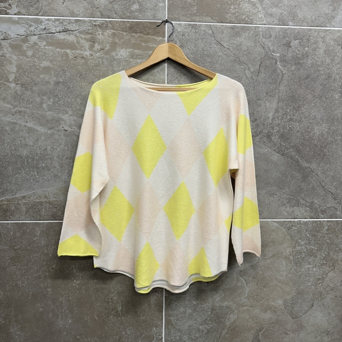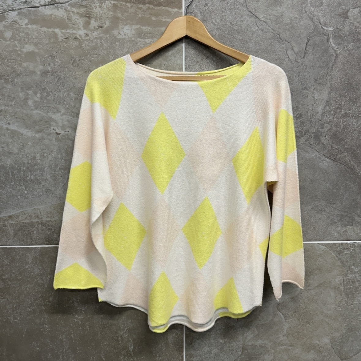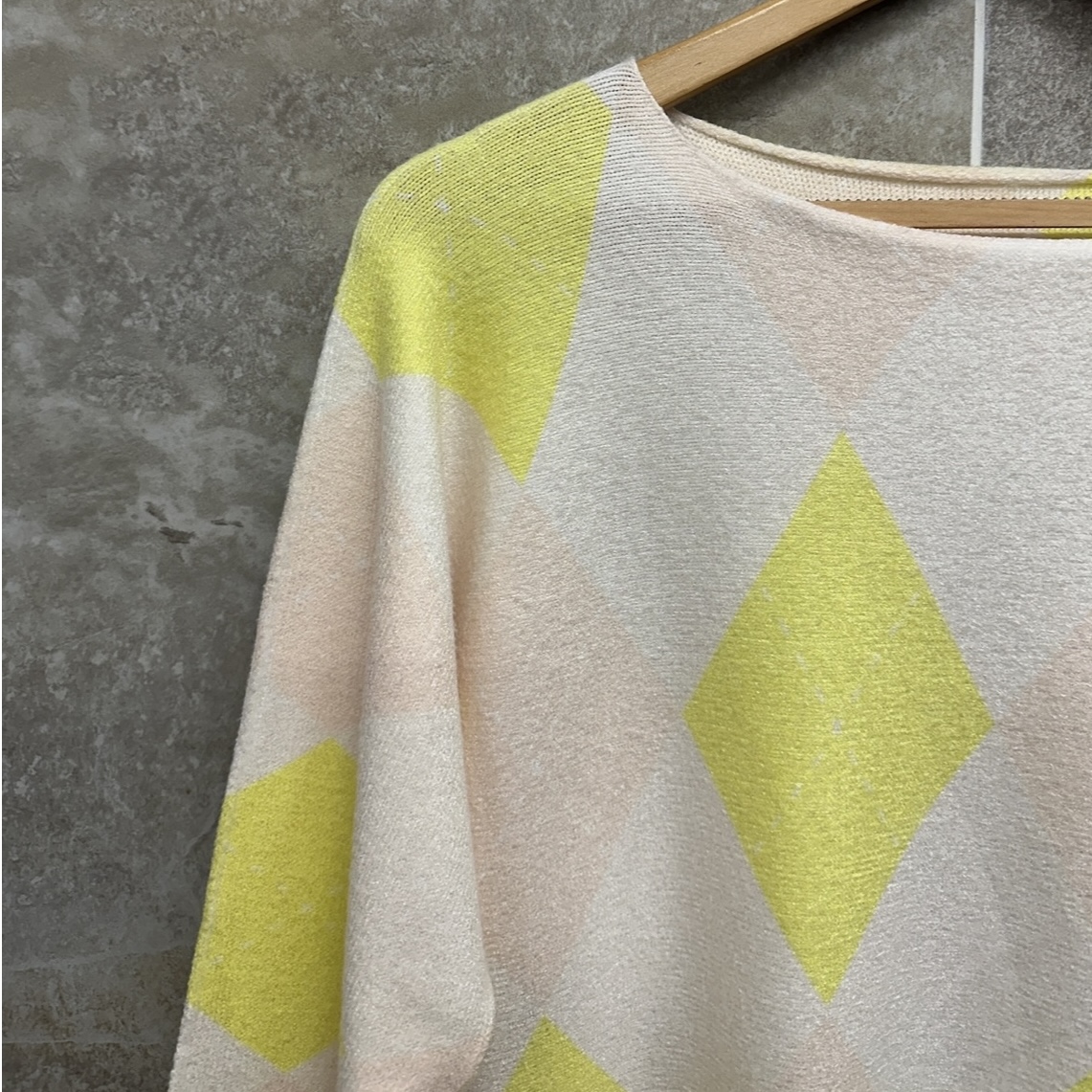 Brighten up your seasonal wardrobe with the Amelia Knit Jumper. Featuring a striking oversized argyle-inspired diamond print, this jumper blends classic heritage vibes with a modern, airy color palette of lemon yellow and soft cream.