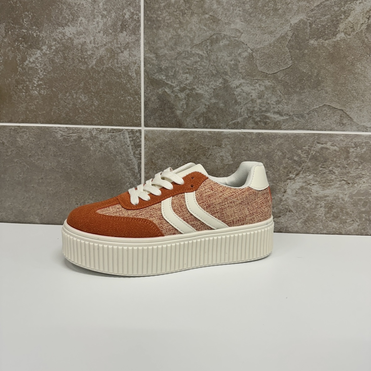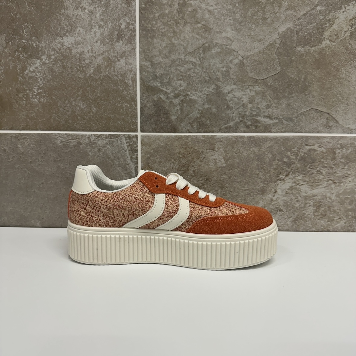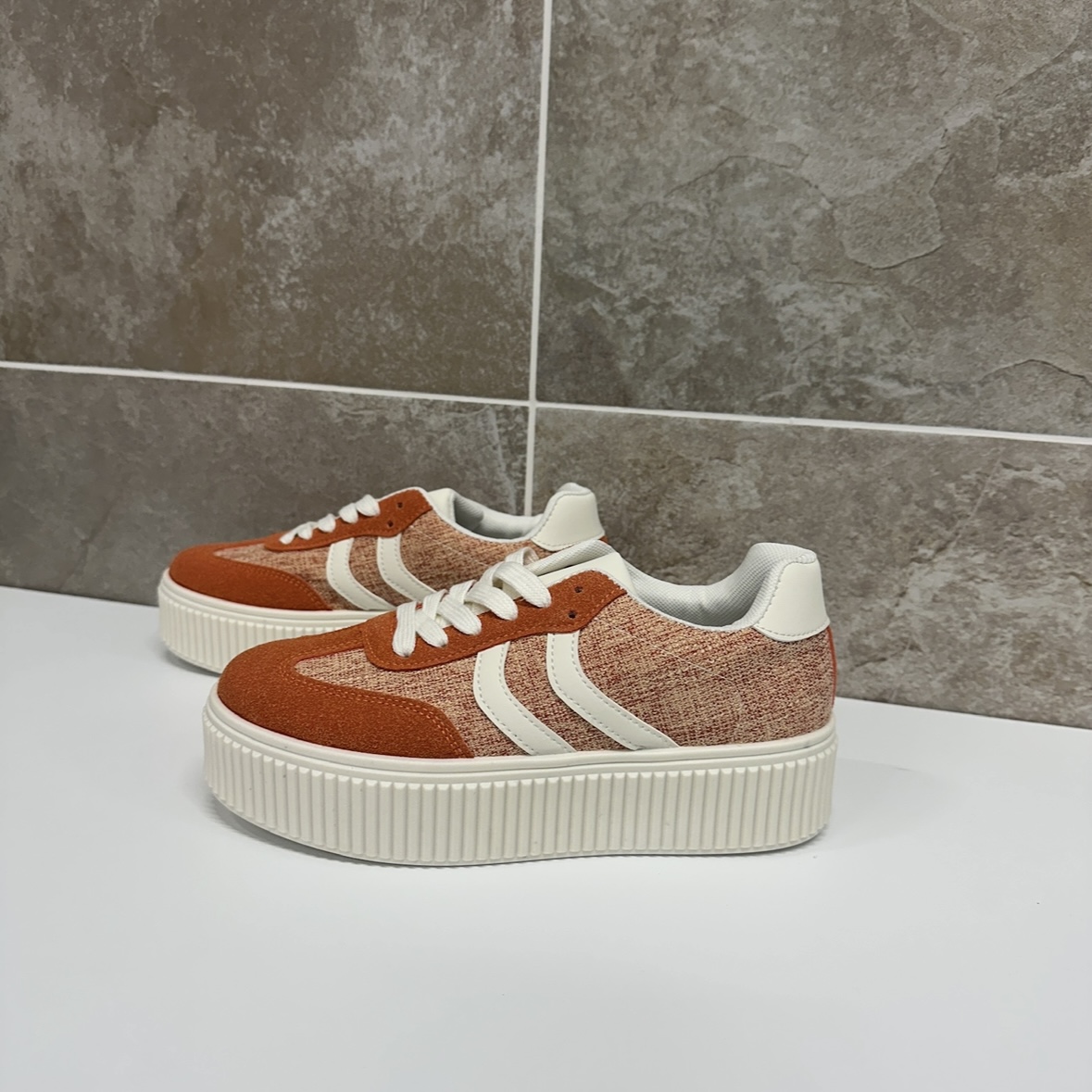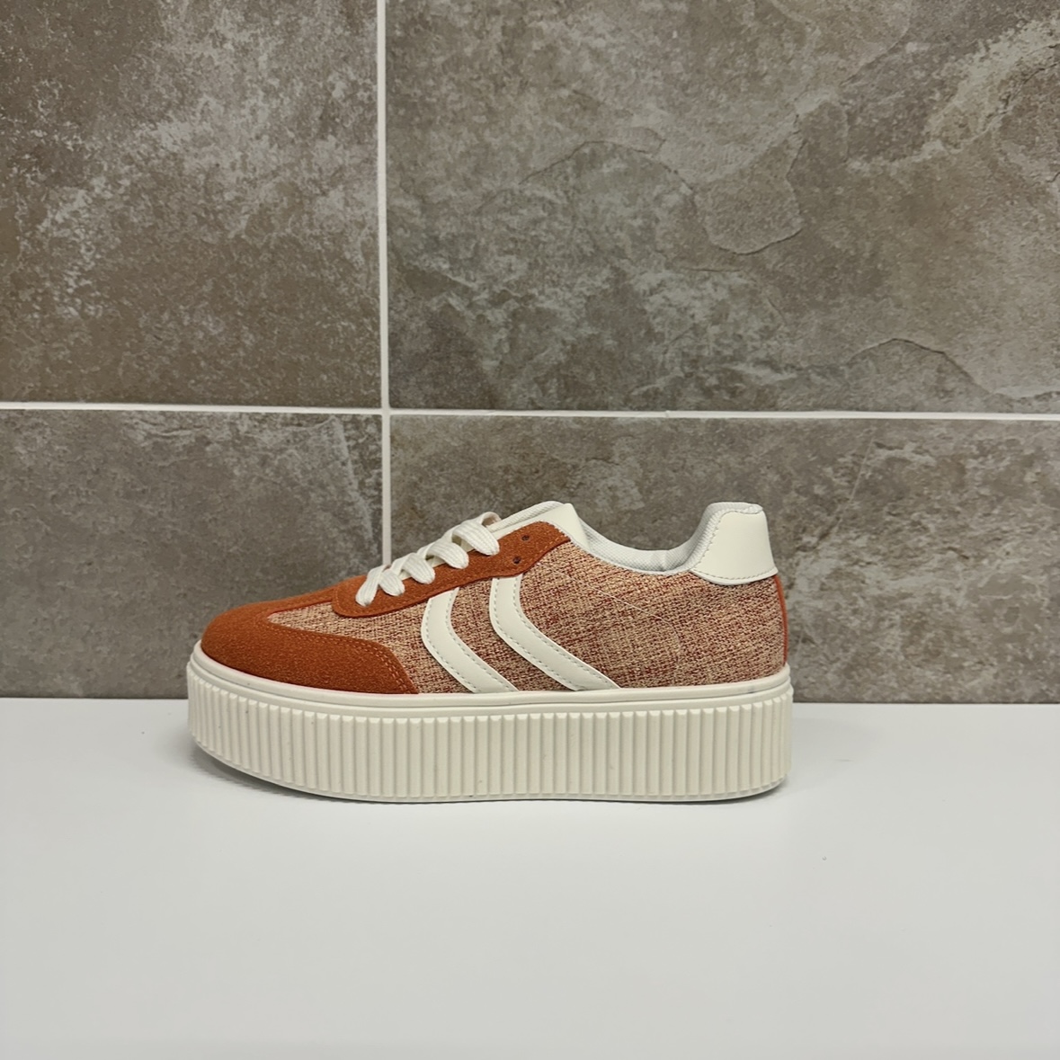 Step up your footwear game with the Isla Women’s Platform Trainers. Blending a retro-inspired silhouette with a modern, chunky aesthetic, these sneakers are designed for those who want to stand tall without sacrificing comfort. Featuring a rich, earthy orange palette and a unique textured canvas finish, they bring a warm, artisanal touch to your everyday street style.