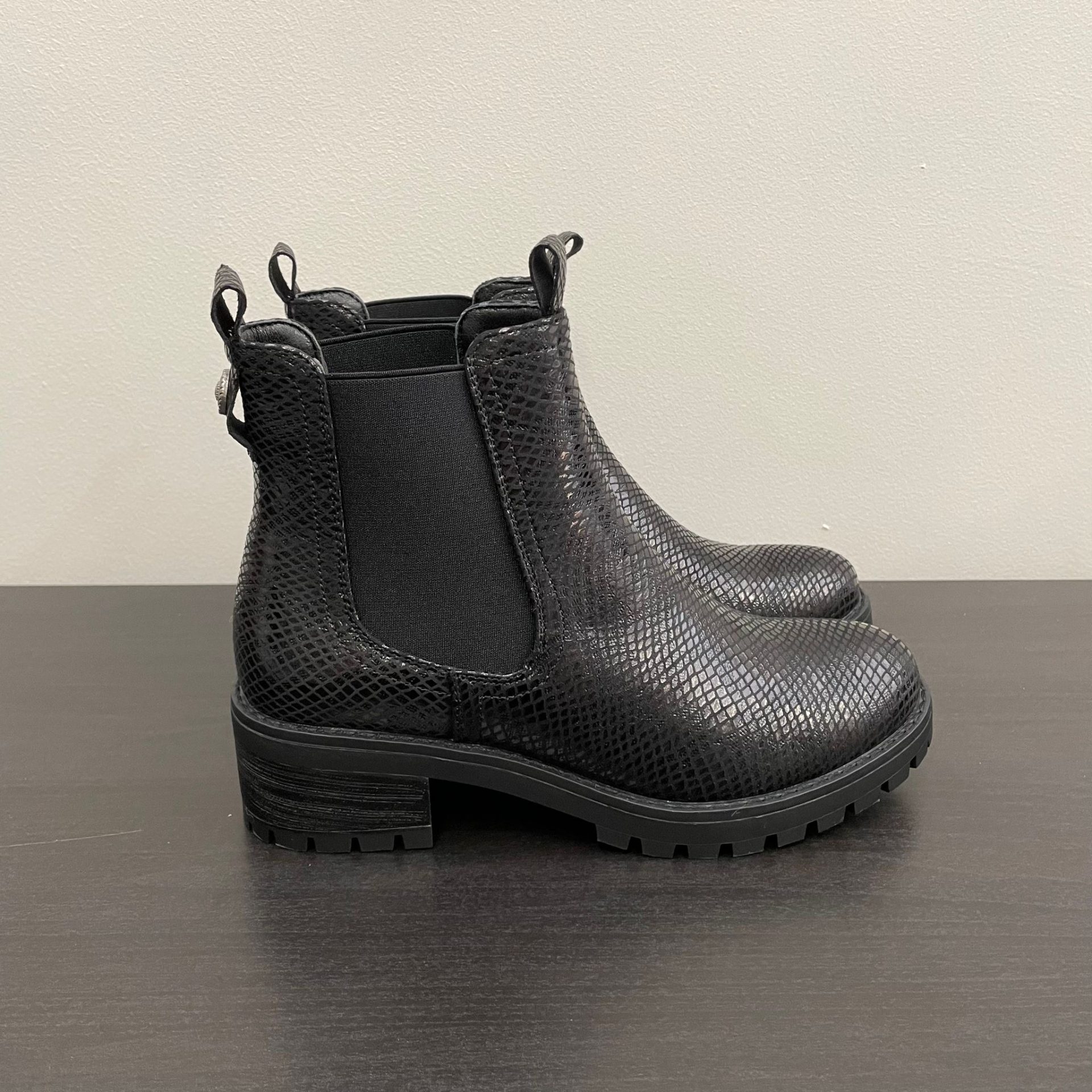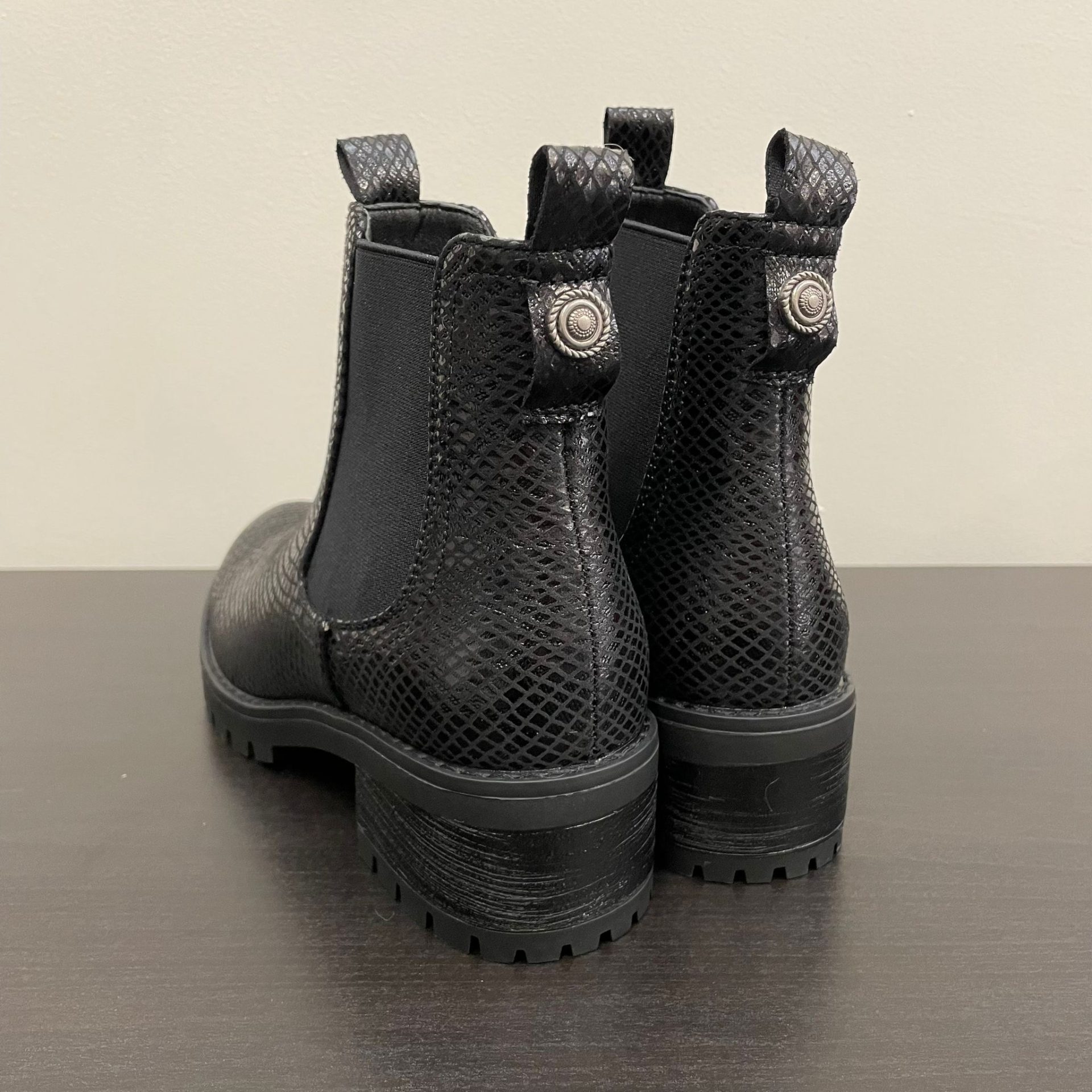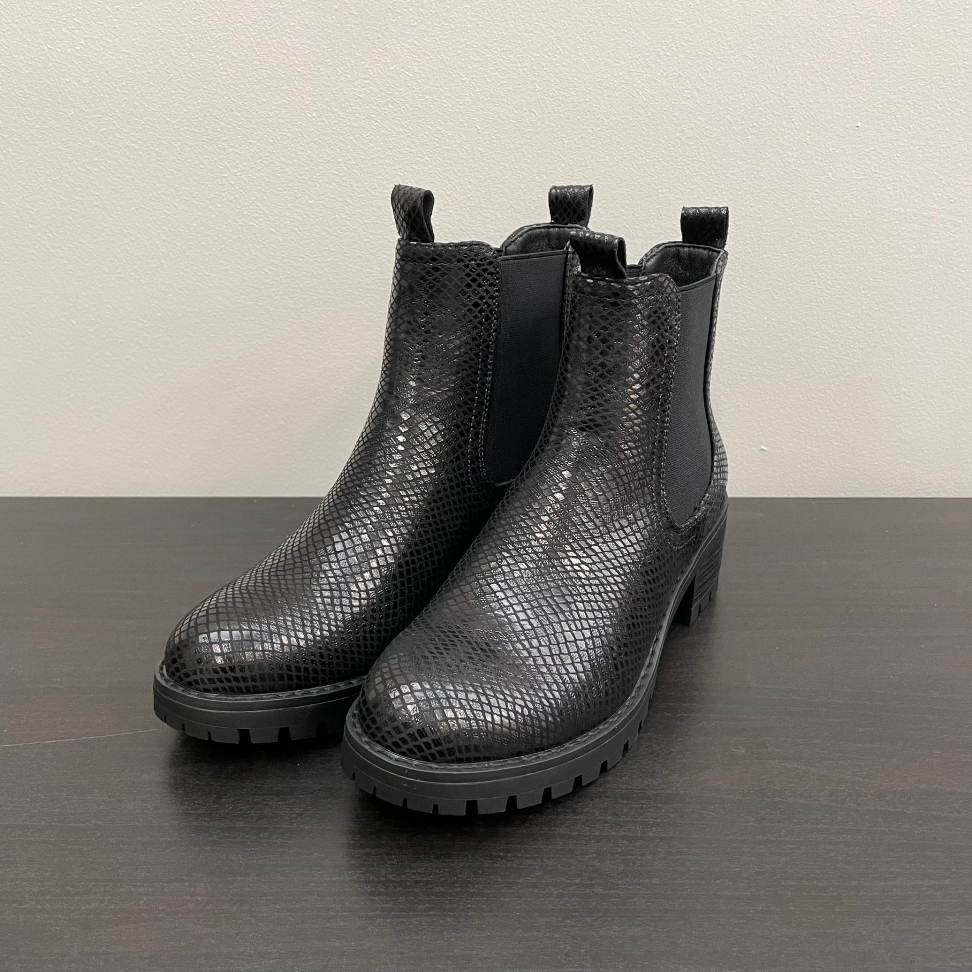 Here are our black croc print chelsea style ankle boots featuring a chunky heeled sole.