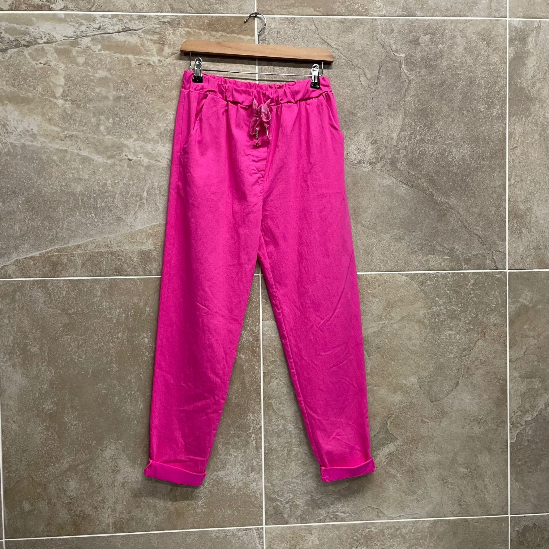 Our Cerise Pink Magic Trousers are available in two comprehensive sizes: