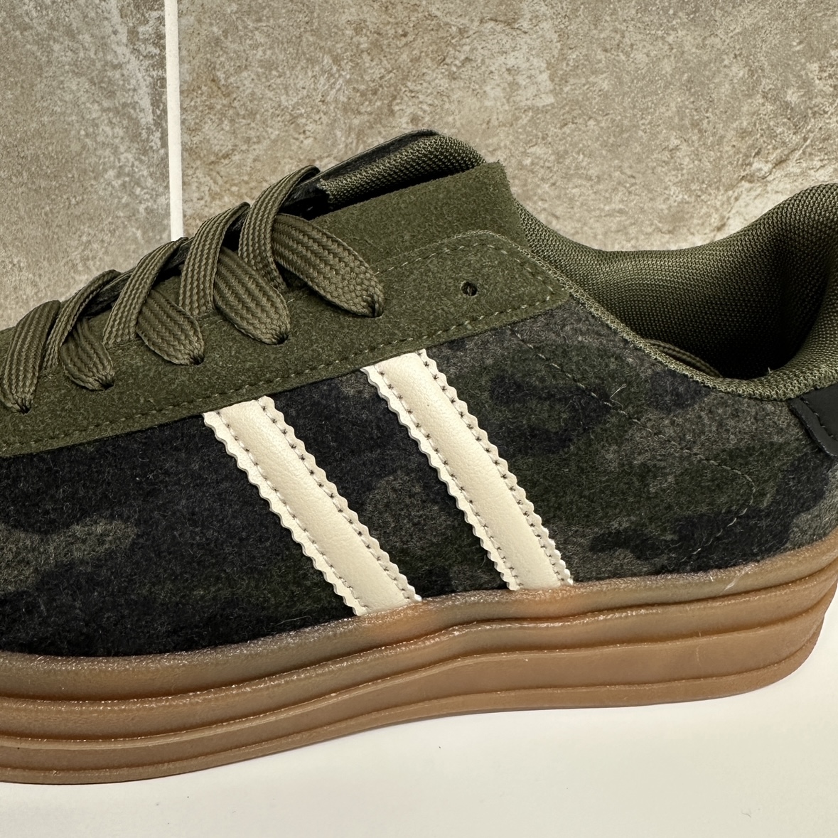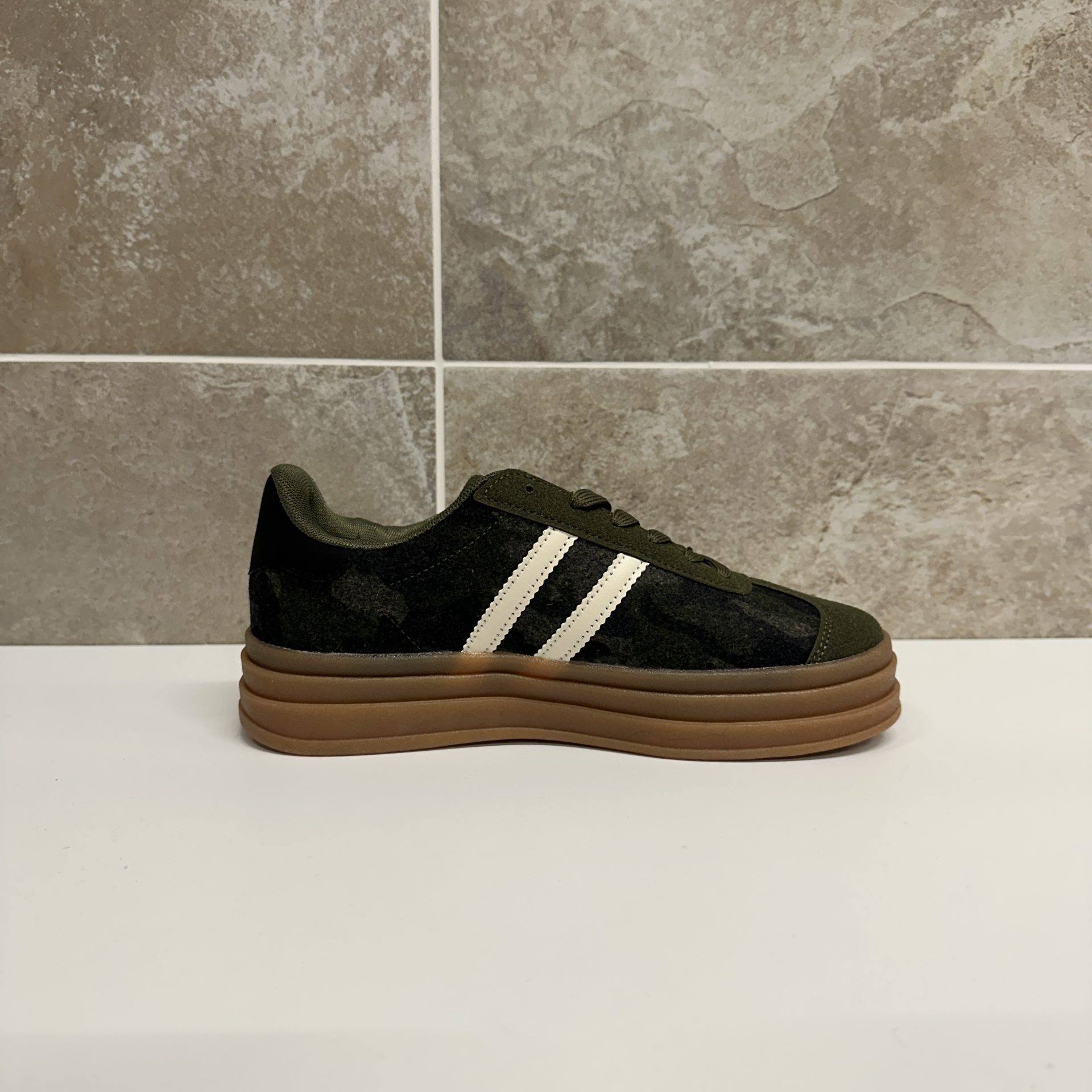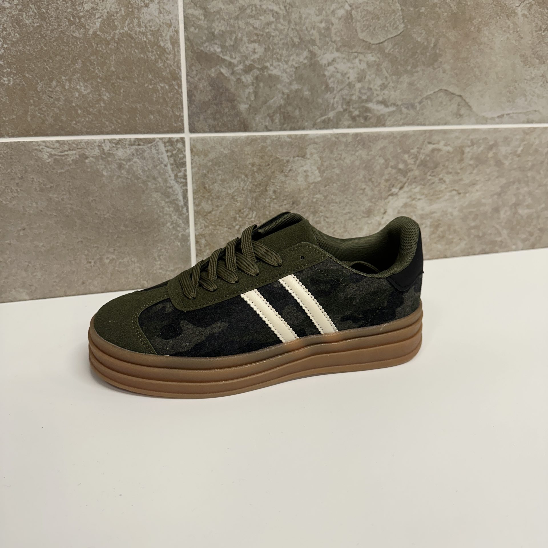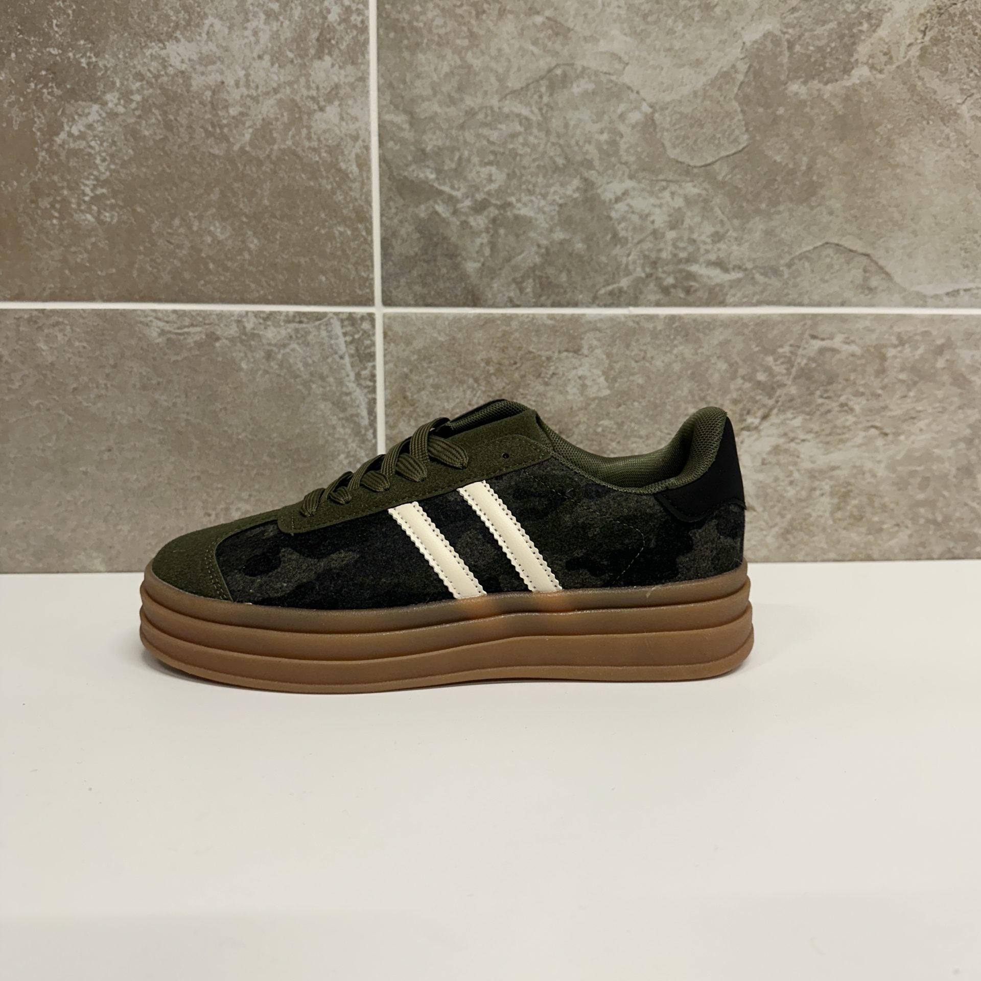 Step up your streetwear game with these women’s army green platform trainers, designed for both style and comfort. Crafted with a camouflage-inspired print and accented by bold white side stripes, these sneakers bring a fresh, sporty edge to any outfit. The chunky gum sole adds extra height and cushioning, ensuring all-day comfort while keeping you on-trend.