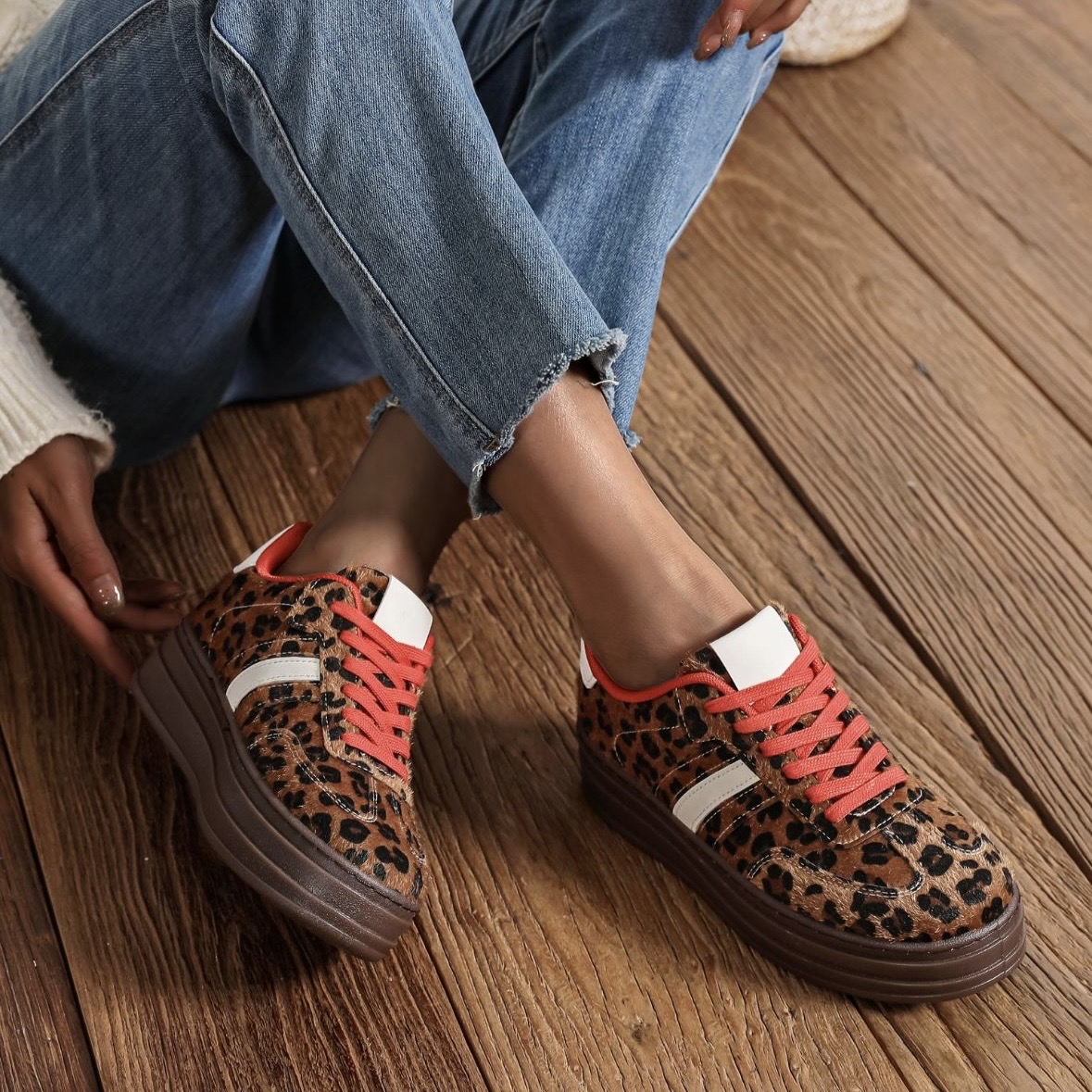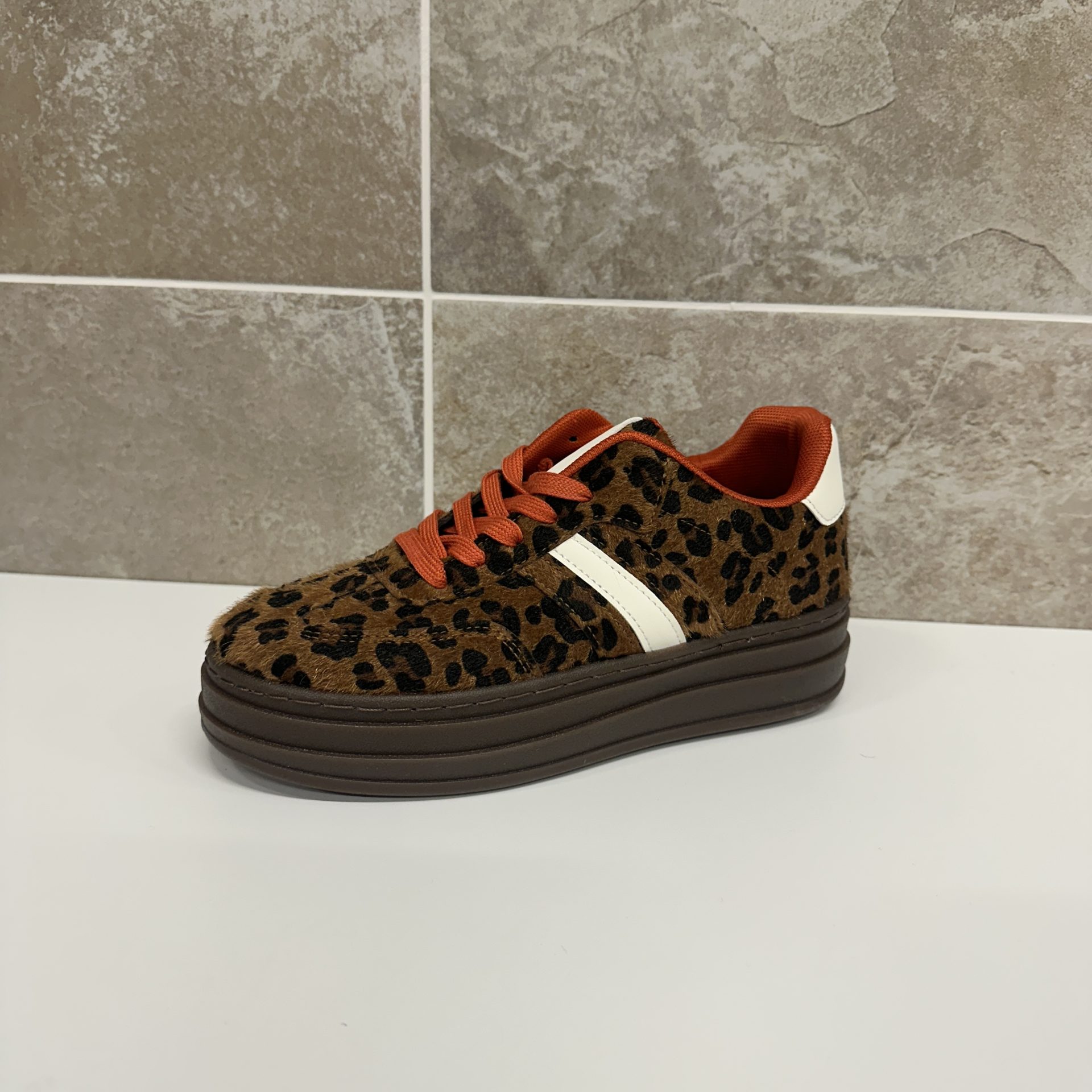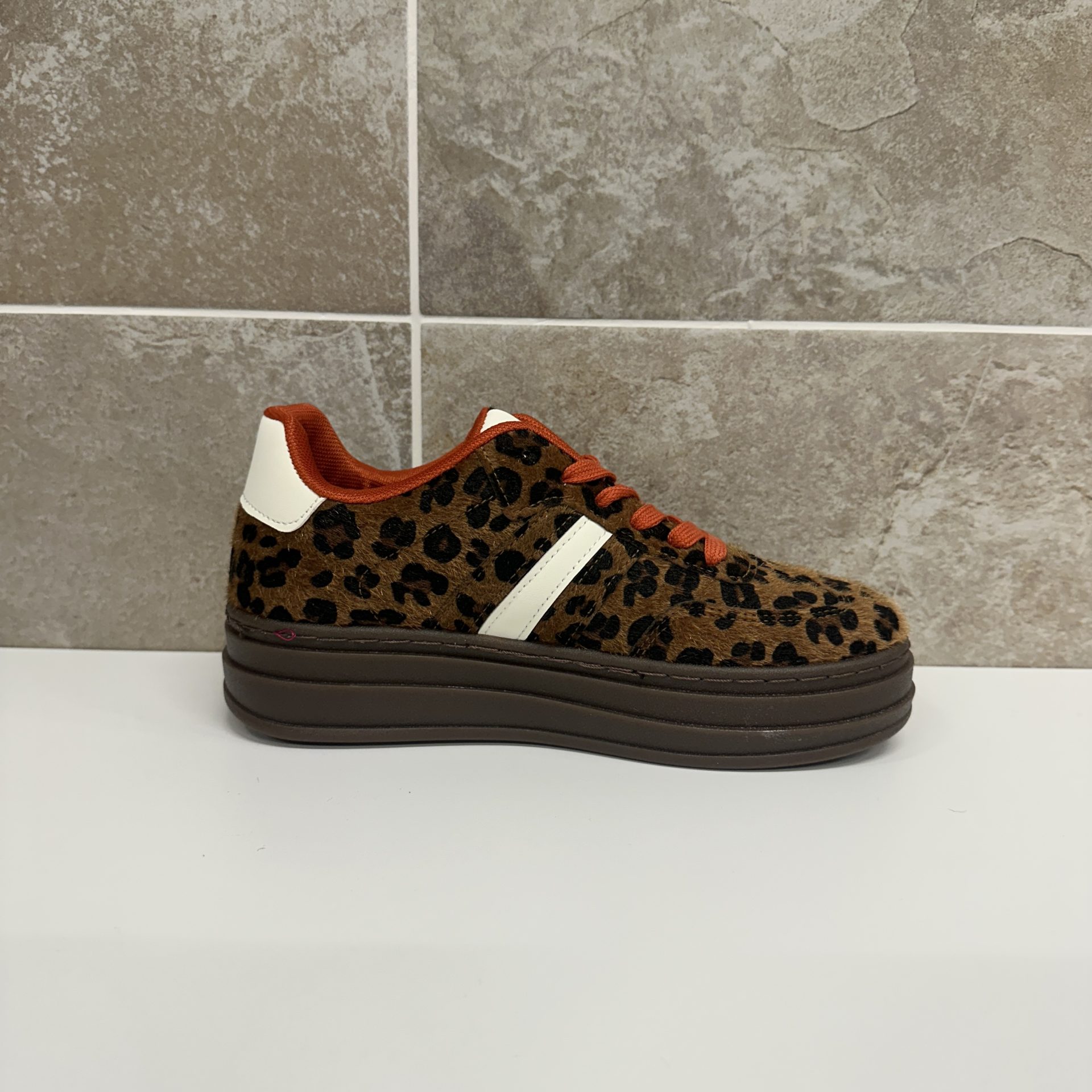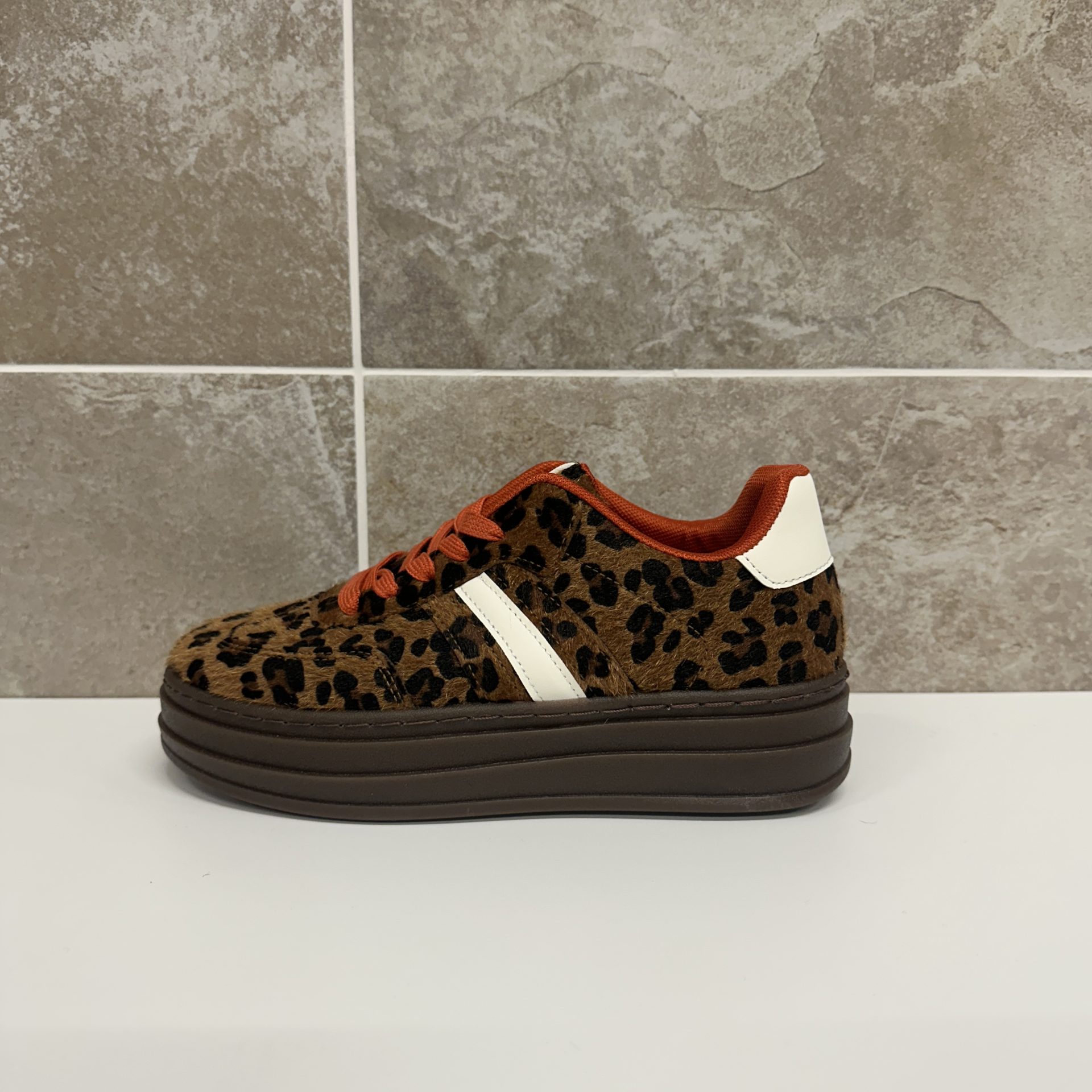 Step into bold style with these leopard print platform sneakers – the perfect blend of fashion-forward design and everyday comfort. Featuring a faux fur-textured upper in a rich brown base with striking black leopard spots, these sneakers instantly elevate any casual look with their statement animal print.